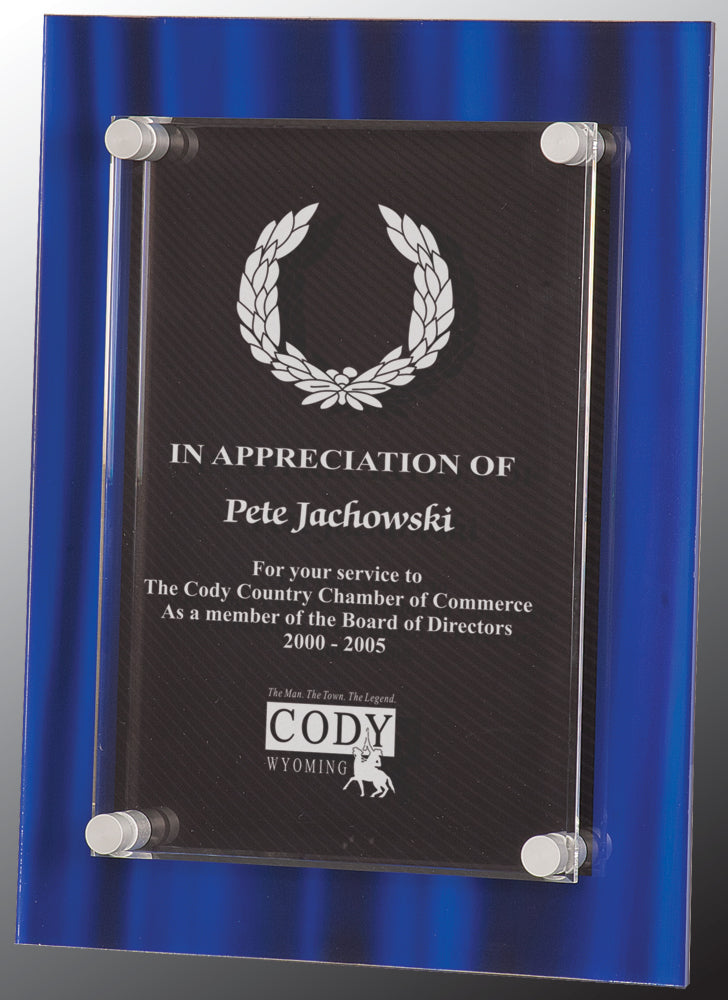Premier Acrylic for outstanding achievement. Stand-Off Acrylic Plaques feature a ¼ inch thick acrylic blank suspended above an acrylic plaque using attached hardware. They are laser engraved with the information and logo you provide.