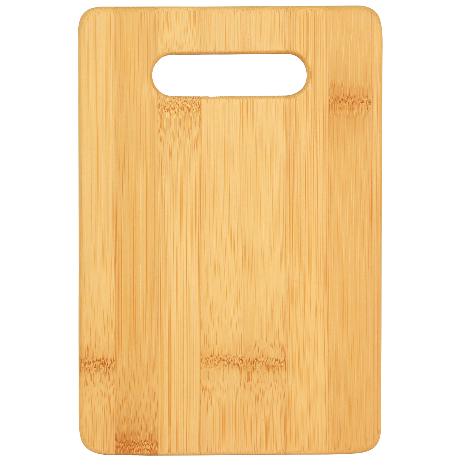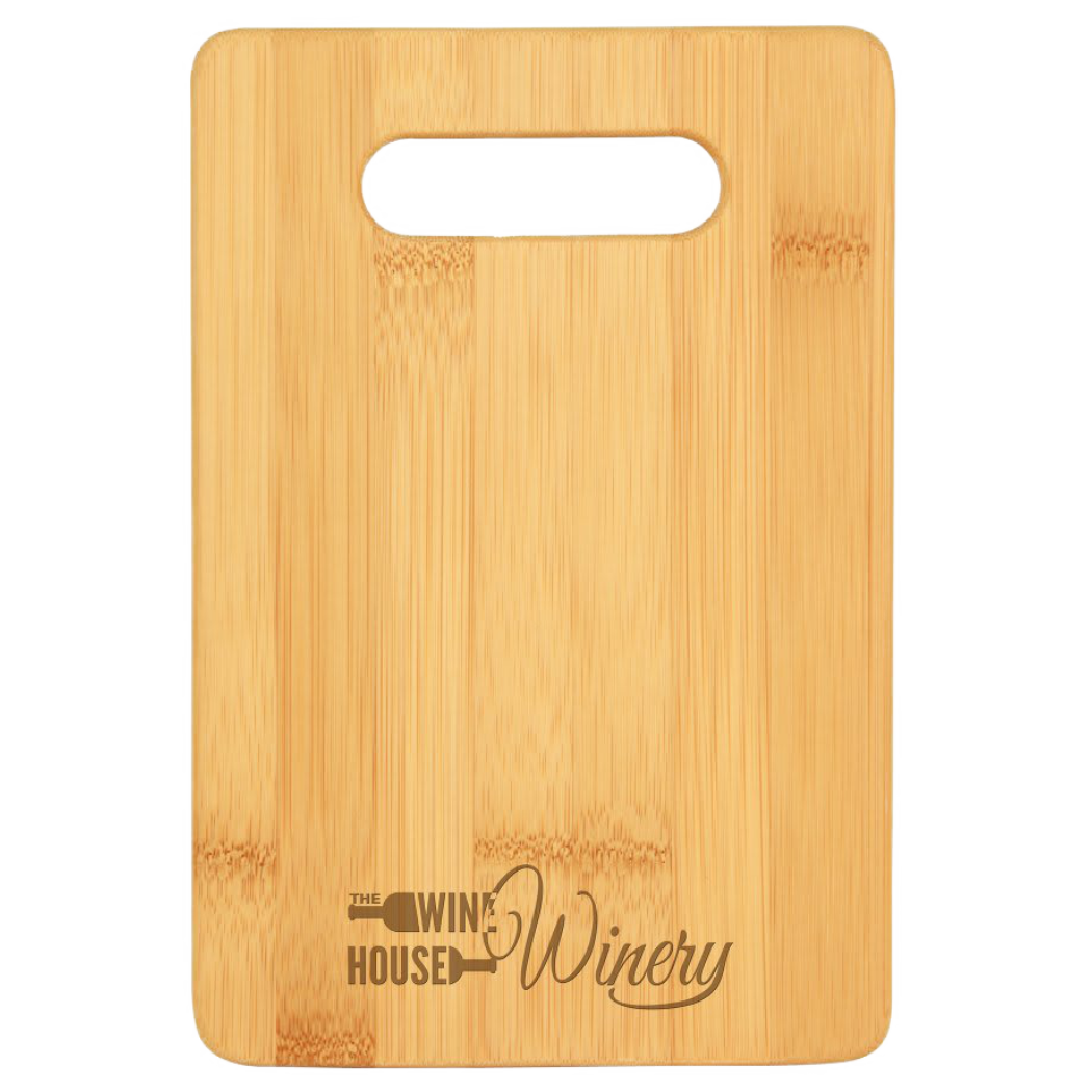 Beautifully crafted 9" x 6" rectangle shaped bamboo cutting board with handle (Lasered Bamboo color varies due to the nature of natural bamboo.)