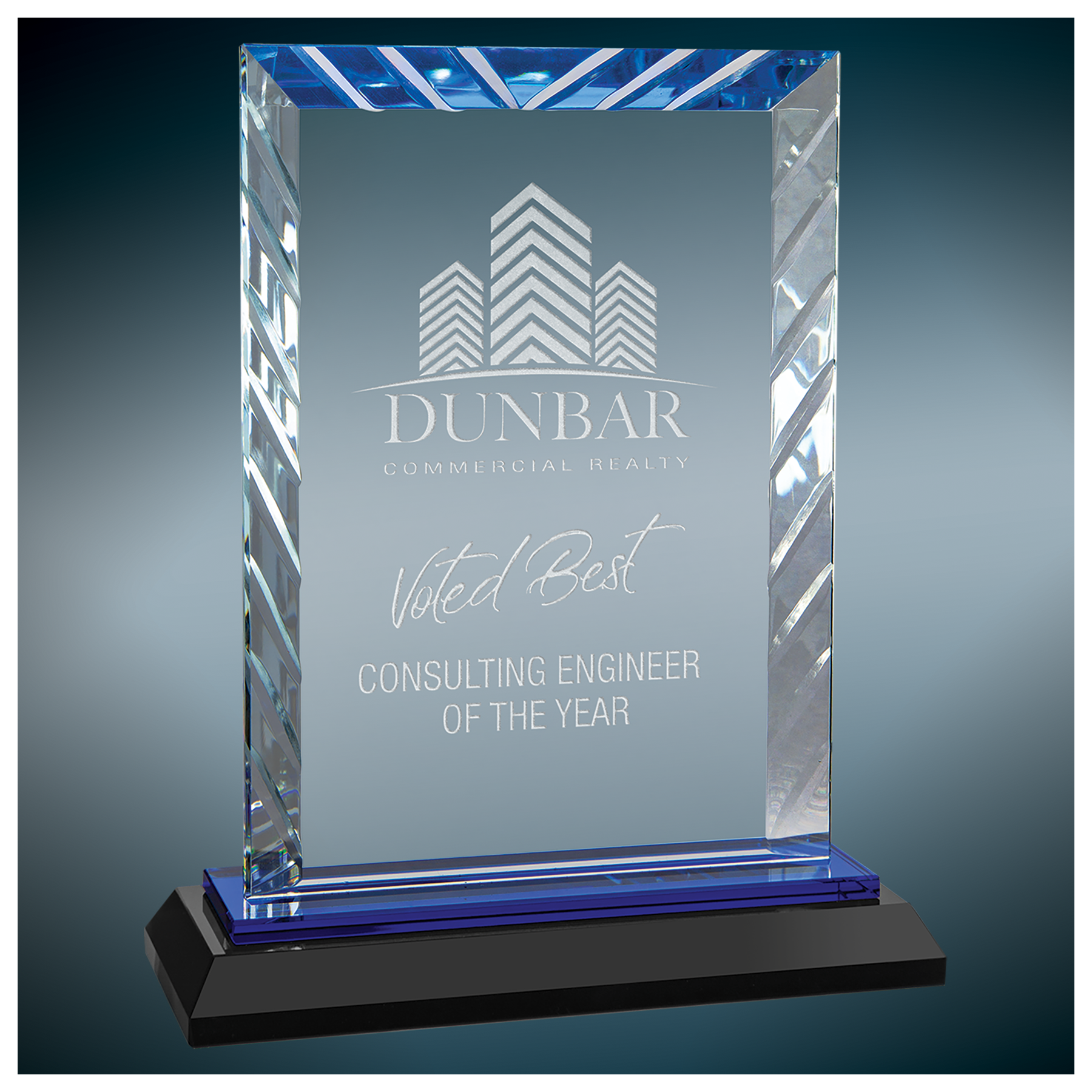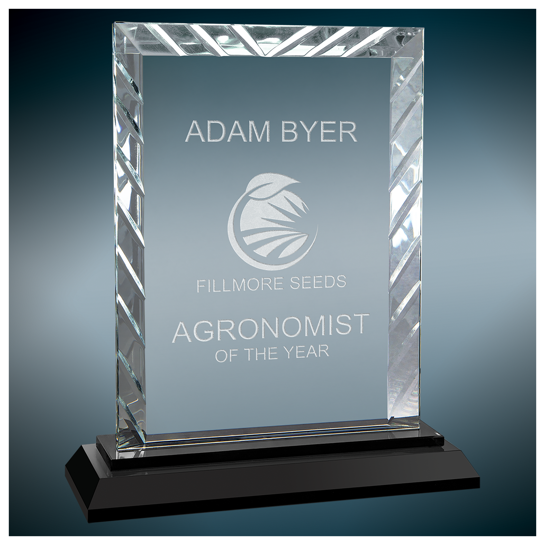 Premier Crystal is the ultimate way to recognize and honor. Premier Accent Glass is individually boxed and mounted on a black or blue glass base. They are laser engraved with the info and logo you provide.