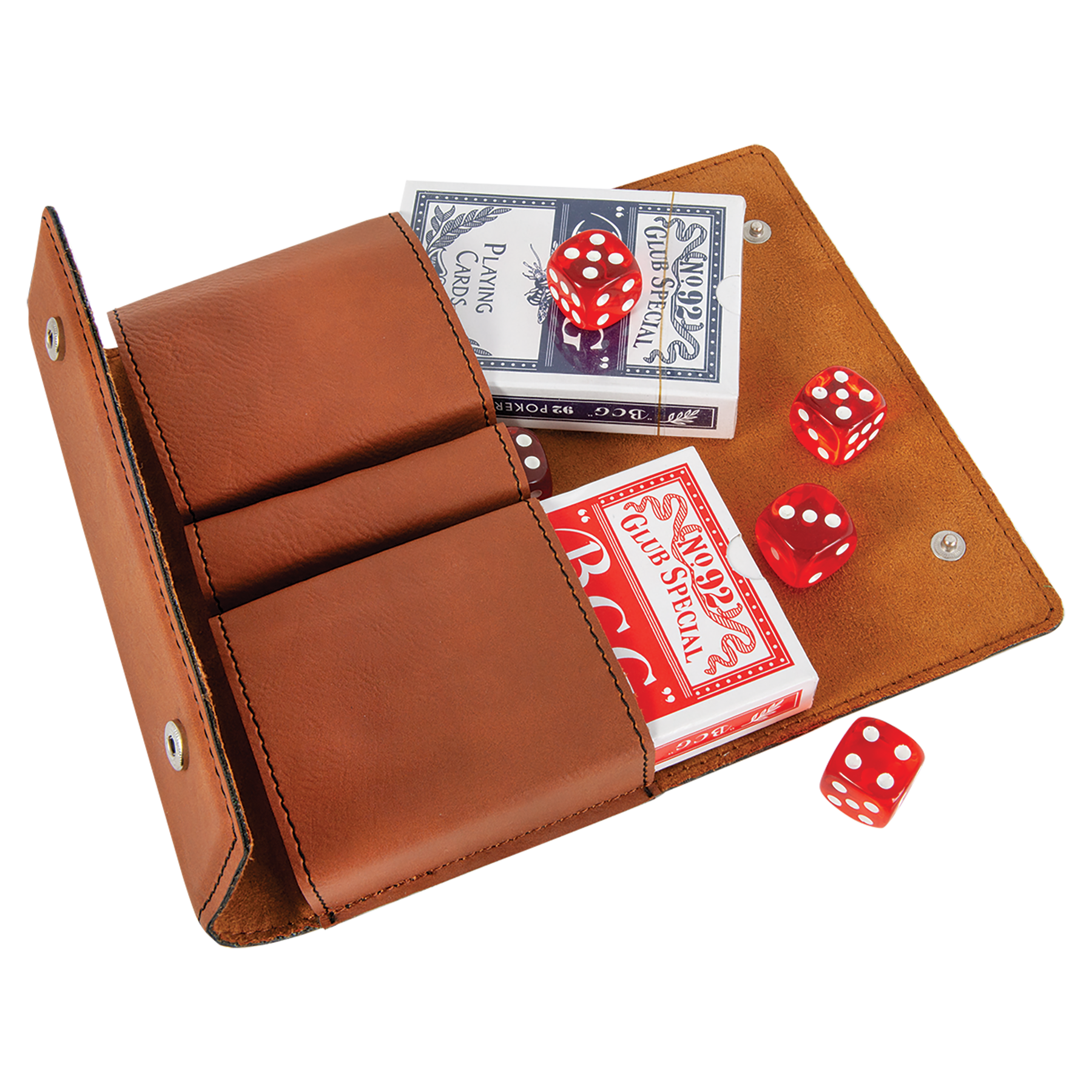 The high-quality workmanship of each leatherette piece is sure to impress every recipient with its elegant individuality. Personalized laser engraving makes this item a unique gift for Birthdays, Anniversaries, Retirements, Graduations, or any Special Occasion. This card set comes with 2 sets of playing cards and five dice.