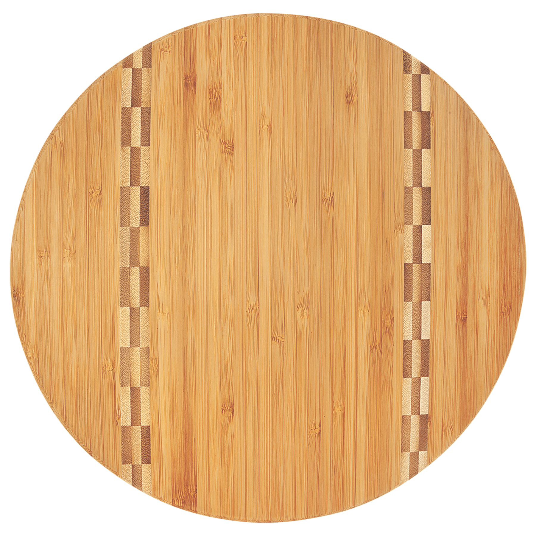9 3/4" Round Bamboo Cutting Board with Butcher Block Inlay. Bamboo includes natural variations in color in wood grain and engraving, adding to the uniqueness of each piece. Your custom design will have a richly toned, deeper hue than the cutting board itself when engraved. (Lasered Bamboo color varies due to the nature of natural bamboo.)